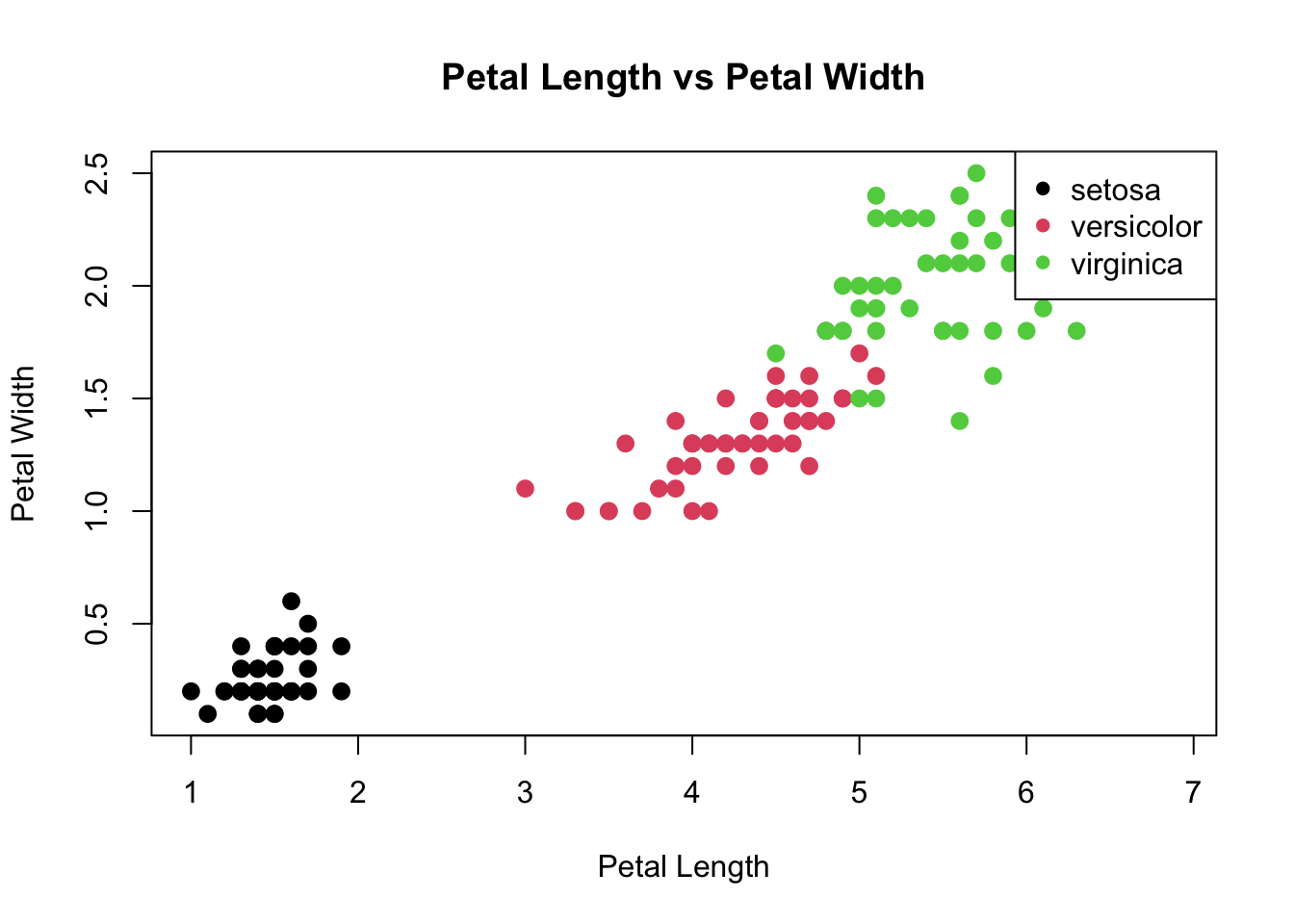 xlab="Petal Length", ylab="Petal Width", col=iris$Species, pch=16, cex=1.3)